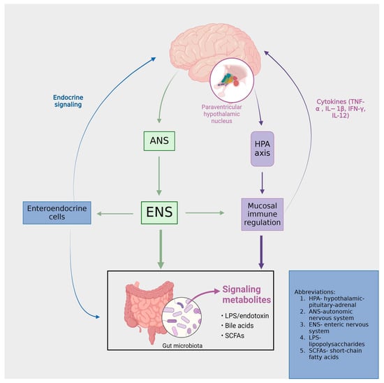 The gut–brain axis (GBA) can be characterized as a multifaceted bidirectional communication system that establishes a connection between the enteric and central nervous systems []. This system transcends mere structural linkage, extending its functionality through endocrine, humoral, metabolic, and immune-mediated signaling pathways. Critical components constituting this axis include the autonomic nervous system, the hypothalamic−pituitary−adrenal (HPA) axis, and the neural network within the GI tract. Such components enable an interactive relationship between the gut and the brain, thereby allowing the brain to exert regulatory influences on various intestinal functions, inclusive of the modulation of functional immune effector cells in the GI tract. In a reciprocal manner, the gut imparts significant effects on neurological aspects, namely mood, cognition, and mental health [].