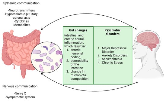 Intriguingly, studies involving fecal microbiota transplants from psychiatric patients to germ-free rodents have demonstrated the induction of symptoms similar to those of the donor’s disorders [,]. Moreover, certain probiotics or fecal microbiota transplants from healthy donors have been effective in alleviating symptoms and inducing positive outcomes in patients with psychiatric disorders [,].