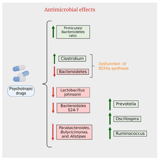 Similar to antibiotics, numerous medications, including antipsychotic drugs (APs), are known to alter the composition of gut microbiota by selectively eliminating certain bacterial species. Studies have documented this effect, emphasizing the impact of APs on microbial diversity [,]. Chlorpromazine, the first developed AP drug, was identified years ago as having antibiotic properties []. Its antibiotic efficacy, found to be more pronounced against Gram-positive bacteria compared to Gram-negative species, is attributed to alterations in the architecture and permeability of microbial membranes [].