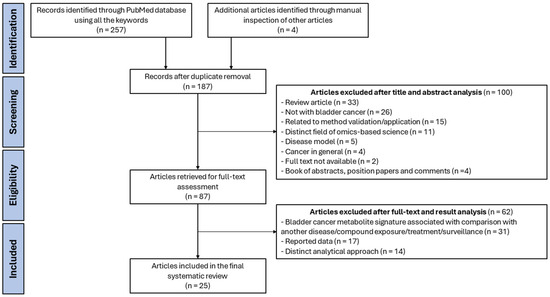 PRISMA flowchart providing a visual summary of the study selection process of the 25 experimental studies included for the systematic review of metabolomics-based research in bladder cancer.