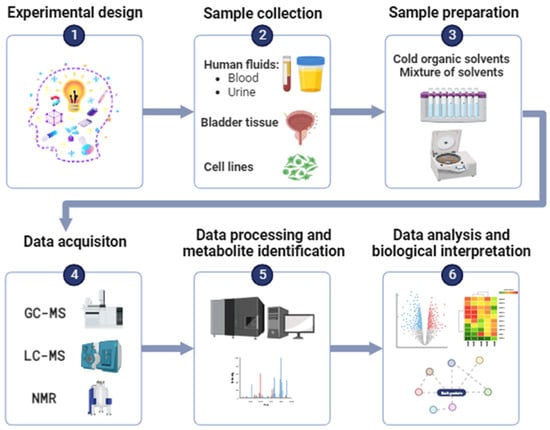 In the field of oncology, metabolomics-based research uses two main analytical techniques for metabolite characterization, namely nuclear magnetic resonance (NMR) and mass spectrometry (MS). Each of these technological platforms has its own characteristics, advantages and disadvantages. The general workflow used for metabolomics-based research in the context of BCa is overviewed in Figure 2.