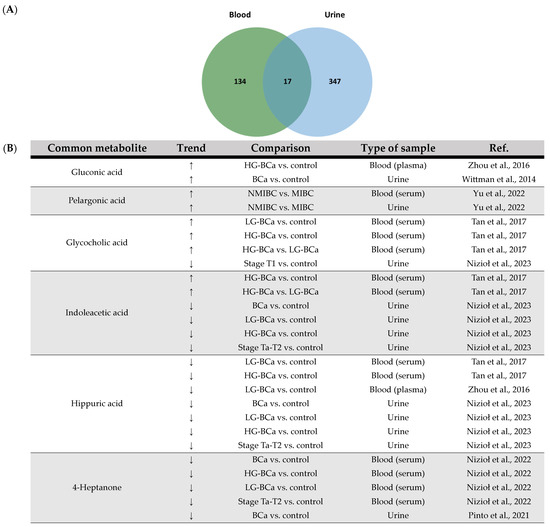 (A) Venn diagram of the integrative analysis of data from the 18 selected papers regarding bladder cancer using a metabolomic approach for the analysis of urine- and blood-derived samples. (B) Common metabolites between urine and blood and respective trend regulation by bladder cancer and type of sample. ↑: increase; ↓: decrease. BCa: bladder cancer; HG: high grade; LG: low grade; NMIBC: non-muscle-invasive bladder cancer; MIBC: muscle-invasive bladder cancer [17,19,20,22,23,30,31,33,34,36,45,46,54,72].