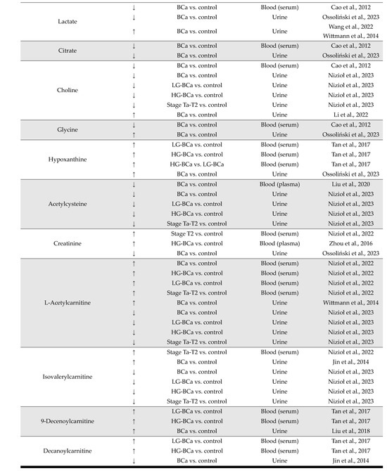 In the next sections, the metabolite profile of each type of sample is critically analyzed in the setting of BCa.