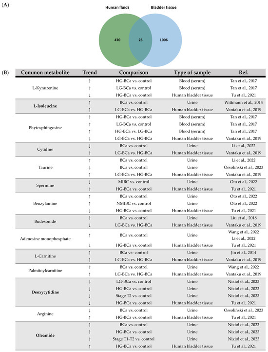 (A) Venn diagram of the integrative analysis of data from the 22 selected papers regarding bladder cancer using a metabolomic approach with human fluid and ex vivo bladder tissue samples. (B) Common metabolites between human fluids and ex vivo bladder tissue and respective trend regulation by bladder cancer and type of sample. Metabolites consistently modulated by BCa in both sample types are highlighted in bold, while those exhibiting a distinct trend in cell lines are marked in bold blue. ↑: increase; ↓: decrease. BCa: bladder cancer; HG: high grade; LG: low grade; NMIBC: non-muscle-invasive bladder cancer; MIBC: muscle-invasive bladder cancer [17,18,19,23,30,33,34,38,39,46,54,60,72,106].