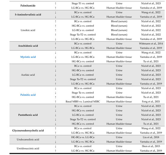 In terms of the use of human fluids vs. cell lines as samples in BCa research, within the 21 selected papers regarding the use of blood, urine and cell line cultures for BCa research, seven common metabolites were found (Figure 5). These include branched-chain amino acids (BCAA), valine and leucine [23,47] as increased metabolites, along with glycine [45,47] and myristic acid [17,47] as decreased metabolites. Notwithstanding, in the case of valine, leucine and glycine, these have recently displayed contradicting results in the study of Ossoliński and coworkers; that is, valine and leucine exhibited decreased urinary levels, whereas glycine revealed increased urinary levels in comparison to healthy controls [46]. Interestingly, BCAA metabolism has been marked as a potential oncogenic metabolic pathway in the sense that it may be perturbed due to increased biosynthetic and nutritional demands involved in tumor progression [109]. Furthermore, glycine is a proteogenic amino acid also linked to tumorigenesis, which is being reported as an important fuel for cancer cell proliferation [110,111]; therefore, its increased consumption can lead to a lower content in cancer cells. The modulation of these amino acids in the context of BCa pathology therefore requires further investigation. In addition, both myristic and palmitic acids showed the same trend of lower levels in urine samples and BCa cells in all studies. This finding highlights the involvement of FA in BCa pathology, especially in the context of the role of FAO as an energy source for tumor development and progression. Regarding the type of samples used in BCa research, human fluids appear to have similar molecular expression compared to cell line cultures.