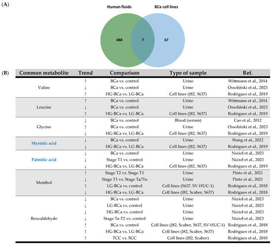 (A) Venn diagram of the integrative analysis of data from the 21 selected papers regarding bladder cancer using a metabolomic approach with human fluid and cell line culture samples. (B) Common metabolites between human fluids and cell lines and respective trend regulation by bladder cancer and type of sample. Metabolites exhibiting a distinct trend in bladder tissue are marked in bold blue. ↑: increase; ↓: decrease. BCa: bladder cancer; HG: high grade; LG: low grade; TCC: transitional cell carcinoma; SCC: squamous cell carcinoma [17,23,34,35,36,45,46,47].
