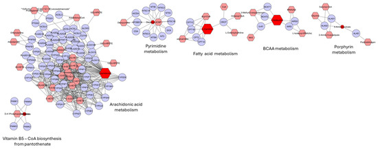 MetScape (v3.1.3; https://metascape.org/) analysis used to examine metabolites that are equally modulated by bladder cancer in both urine and bladder cancer tissue, highlighting the pathways in which these metabolites are actively involved. Enlarged red nodes correspond to metabolites found at higher levels, whereas smaller red nodes represent those present at lower levels in BCa settings. The metabolites from which the identified compounds may originate or derive are represented by pink hexagons, while the proteins (identified by gene name) involved in the metabolic processes are denoted by blue circles. The comprehensive details of pathway enrichment, including the associated metabolites for each pathway along with their corresponding FDR and p-values, are presented in Table S8.