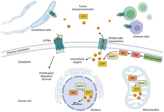 Cancer cells often have abundant SphK1 in the cytoplasm, and S1P production is enhanced [,]. In cancer development and progression, S1P “inside-out” signaling plays a critical role, and S1P acts on S1P receptors on the plasma membrane of the cancer cell itself and in the surrounding microenvironment via autocrine and paracrine modes of action [,]. The expression of S1PR1 and S1PR3 is often higher in breast cancer, suggesting that signaling through these receptors contributes to cancer growth and invasion [,,,,,]. S1P also acts on S1PR1 on vascular endothelial cells to induce angiogenesis [,] and on S1PR1 on immune cells to promote migration []. Thus, the SphKs/S1P/S1PRs signaling pathway is thought to contribute to the formation of the cancer immune microenvironment [,].