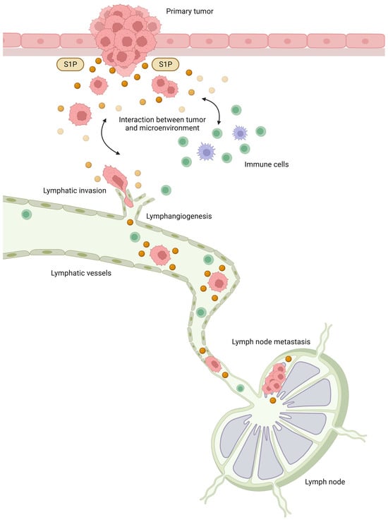 Our previous studies have revealed various roles for S1P in the interaction between cancer and the microenvironment [], and we speculated that S1P may play a major role in lymphatic metastasis (Figure 2). In brief, S1P produced by cancer is released into the interstitial fluid and contributes to the interaction between cancer cells and the microenvironment, together with cytokines and chemokines, which also regulate the physiological functions of cancer cells and mesenchymal cells in the cancer microenvironment. In the cancer microenvironment, S1P promotes cancer cell proliferation and invasion and contributes to the formation of a favorable microenvironment for cancer progression via angiogenesis, lymphangiogenesis, and immune cell mobilization. S1P may contribute to lymphangiogenesis by acting on lymphatic endothelial cells, and S1P in lymphatic vessels may also contribute to the survival of free-floating cancer cells and lymph node metastasis based on our hypothesis.