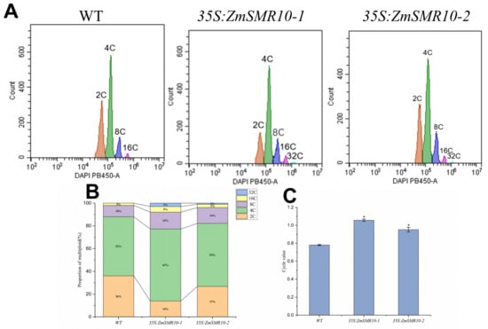 Cellular ploidy analysis was conducted on Arabidopsis thaliana transgenic lines that were transduced with 35S: ZmSMR10. (A) The DNA ploidy assay of leaves from both the WT and transgenic A. thaliana was examined at the shoot stage. (B) The ratio of cells with different karyotypes in the leaves of both WT and transgenic A. thaliana at the shoot stage was also evaluated. (C) The intracellular replication indices in leaves of the WT and transgenic A. thaliana at the shoot stage were analyzed, and significant differences in the C-values between the WT and transgenic A. thaliana were observed. The means ± SE (bar) were obtained from three independent experiments. * p < 0.05.
