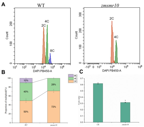 A cellular ploidy analysis was conducted on the maize mutants with the EMS mutation zmsmr10. (A) A DNA ploidy assay was performed on the leaves of both the WT and zmsmr10 at the 3-leaf-1-heart stage. (B) The ratio of cells with different karyotypes was evaluated in leaves of both the WT and zmsmr10 at the three-leaf monocarp stage. (C) Statistical analysis of intracellular replication indices was also carried out on leaves of both the WT and zmsmr10 at the three-leaf monocarp stage. The mean ± SE were calculated from three independent experiments. Independent t-tests demonstrated significant differences in the C-values between the WT and zmsmr10. Ethylmethanesulfonate, EMS; WT, wild-type. * p < 0.05.