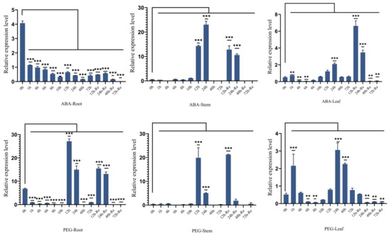 qRT-PCR quantification of ZmSMR10 in maize leaves, stems, and roots of B73 treated with 100 μM ABA and 15% PEG. The horizontal coordinates are 0 h, 1 h, …, 72 h, the time after ABA and PEG treatments, 12 h-Re…7 2h-Re, and time of re-watering after 72 h of abiotic treatment. The vertical coordinate is the relative expression of ZmSMR10. Data are the mean ± SE (bar). n = 3. ** p < 0.01, *** p < 0.001.