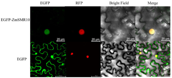 The fusion expression vectors 35s: green-GFP-ZmSMR10, pGFP-ZmSMR10/35s: green-GFP, and nuclear marker were constructed by homologous recombination and transferred into the GV3101 strain by chemical transformation. The pGFP-ZmSMR10 bacteriophage and nuclear marker bacteriophage were mixed in a 1:1 ratio as the experimental group, while the empty vector 35s: green-GFP nuclear marker bacteriophage was mixed in the same ratio as the control group. The OD of the bacterial solution was adjusted to 0.8 using a diluent of Agrobacterium that consisted of 10 mM morpholine ethanesulfonic acid, 50 mM MgCl2•6H2O, and 0.15 mM acetosyringone solubilized in dimethyl sulfoxide (DMSO). Subsequently, the bacterial solution was incubated in the dark for 2 to 3 h at room temperature. Finally, the bacteriophage solution was injected into 4-week-old tobacco plants and grown in a greenhouse at 22 °C at a relative humidity (RH) of 70% and a 16 h/8 h light/dark photoperiod. The samples were observed using a confocal laser scanning microscope between 48 and 72 h (Leica TCS SP8, Leica, Wetzlar, Germany).