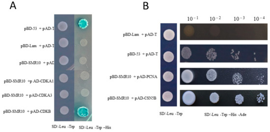Based on the references and protein interaction prediction from the STRING website, we proposed that the three proteins ZmCDKA;1, ZmCDKA;3, and ZmCDKB1;1 interact. They are part of the cell-cycle protein kinase family. The yeast two-hybrid experiment indicated that ZmSMR10 did not interact with ZmCDKA;1 or ZmCDKA;3. It interacted only weakly with ZmCDKB1;1 in the SD-T-L-H triple-deficient medium (Figure 11A). To explore the regulatory pathway of the ZmSMR10 protein, we screened a yeast library and found that ZmPCNA2 and ZmCSN5B were two very interesting genes (Figure 11B). Proliferating cell nuclear antigen2 (PCNA2) is a protein associated with the cell cycle that serves as an auxiliary protein for DNA polymerases. Its expression gradually increases from the G1 to the S phase and reaches a peak in the S phase [22]. The COP9 signalosome complex subunit 5b (CSN5B) is a protein found in A. thaliana that is associated with growth and development. The CSN gene family plays an important role in the G2 phase of the cell cycle [23].