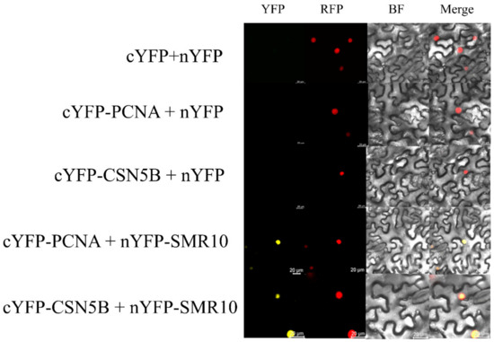 Confirmation of the interaction between ZmSMR10 and ZmPCNA2/ZmCSN5B using BIFC experiments. Red, nuclear marker. BIFC, bimolecular fluorescence complementation; YFP, yellow fluorescence protein (Bar = 20 μm).