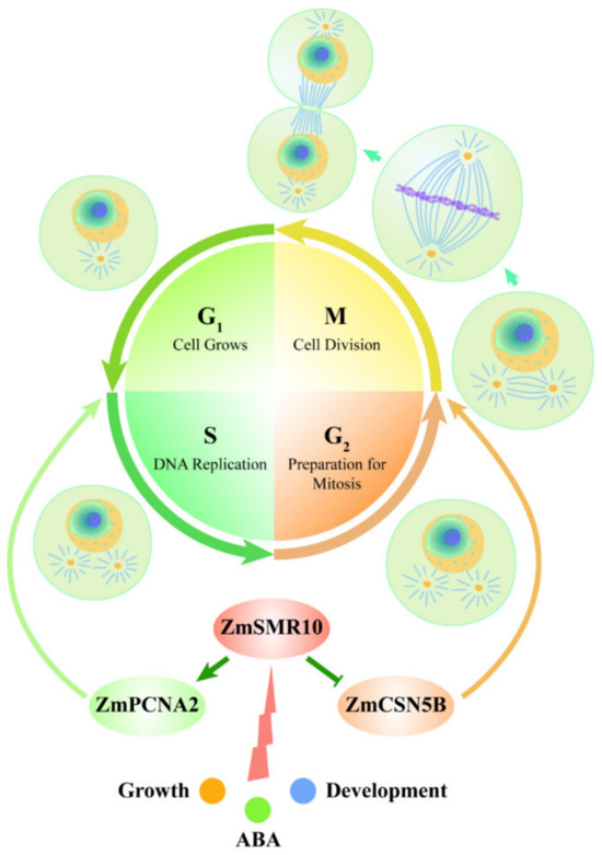 Three approaches were used to verify that there is a strong interaction between these proteins. They included yeast two-hybrid, BiFC, and CoIP experiments. Their functions in the cell cycle were identified as the promotion of the G1 to S phase mediated by PCNA2 [37] and initiation of the transition from G2 to the M phase by CSN5B [49]. Endoreplication is accomplished in two key steps, which include activation of the S phase and inhibition of the M phase [50]. The findings of previous studies led to a prediction of the molecular regulatory pathways by which ZmSMR10 promotes replication in plants. When a cell receives a signal indicating the need for endoreplication in the plant, highly expressed ZmSMR10 may enhance the activity of the ZmPCNA2 protein, which leads to extensive cell replication. Simultaneously, it may also inhibit the activity of the ZmCSN5B protein, which results in cells that cannot divide normally. At this point, the highly active ZmPCNA2 protein activates the G1 to S phase transition, which enables the DNA to continue replicating. In the G2 phase, the cell, which once again stagnates, undergoes a few rounds of endoreplication. The amount of DNA in the cells eventually increases exponentially. Therefore, the overexpression of ZmSMR10 causes an increase in plant ploidy, which results in changes in plant growth and development, phenotype, and stress resistance (Figure 14).