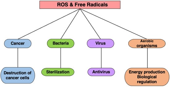 - Gerschman, R.; Gilbert, D.L.; Nye, S.W.; Dwyer, P.; Fenn, W.O. Oxygen poisoning and x-irradiation: A mechanism in common. Science 1954, 119, 623–626. [Google Scholar] [CrossRef]