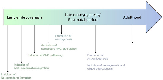 Beyond the regulation of mesoderm derivatives’ identity, BMPs play a pivotal role in CNS development and patterning (24, Figure 1). As identified over 100 years ago by Spemann and Mangold, inhibition of the BMP pathway is initially required for neurectoderm differentiation during gastrulation [42]. BMPs’ role extends beyond these early stages of embryogenesis since the activation of the pathway is necessary for the appropriate specification of the neural stem cells’ (NSCs) fate [43,44,45]. NSCs are multipotent progenitors that can differentiate into neurons or glial cells, including astrocytes and oligodendrocytes in the CNS. Under the effect of BMP secretion by the ectoderm and the roof of the neural tube, a dorsal-high/ventral-low gradient establishes the polarity of the neural tube [46,47,48,49,50]. This gradient first promotes neurogenesis during the early stages of development, committing NSCs to a neuronal phenotype. Later, including in the post-natal period, BMP activation switches from this pro-neuronal activity to the promotion of gliomagenesis, and mostly induces astroglial differentiation [51,52]. Indeed, activation of the canonical SMAD1/5/8-dependent pathway leads to an upregulation of the inhibitor of differentiation-1 (ID1) expression, both known to degrade pro-neurogenic factors such as Mash1 [53,54] and to associate with the signal transducer and activator of transcription-3 (STAT3) to promote astrocyte differentiation [55,56]. Concomitantly with this pro-astroglial effect, BMP activation antagonizes oligodendrocyte progenitor cell (OPC) differentiation by inducing ID2/ID4 expression. Indeed, ID2/ID4 prevent the nuclear translocation of Olig1/2 transcription factors that specifically guide oligodendrocyte differentiation by inducing oligogenic gene expression, such as myelin basic protein (MBP) or 2′,3′-cyclic nucleotide 3′-phosphodiesterase (CNP) [57,58,59,60]. BMP signaling also plays a critical role in maintaining adult NSC niches in the subventricular zone (SVZ) and subgranular zone (SGZ) to allow neuronal and glial regeneration, indicating that the role of BMPs in the CNS is not limited to antenatal development.