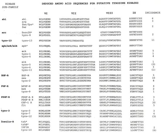 - Partanen, J.; Makela, T.P.; Alitalo, R.; Lehvaslaiho, H.; Alitalo, K. Putative tyrosine kinases expressed in K-562 human leukemia cells. Proc. Natl. Acad. Sci. USA 1990, 87, 8913–8917. [Google Scholar] [CrossRef]