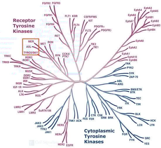 - Biscardi, J.S.; Denhez, F.; Buehler, G.F.; Chesnutt, D.A.; Baragona, S.C.; O’Bryan, J.P.; Der, C.J.; Fiordalisi, J.J.; Fults, D.W.; Maness, P.F. Rek, a gene expressed in retina and brain, encodes a receptor tyrosine kinase of the Axl/Tyro3 family. J. Biol. Chem. 1996, 271, 29049–29059. [Google Scholar] [CrossRef][Green Version]