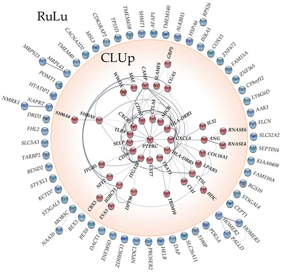 To elucidate the predominant gene ontologies (GOs) characterizing our identified DEGs, we conducted a comprehensive over-representation analysis (ORA) encompassing all selected DEGs as well as the cluster derived from the network analysis. This analysis used information on biological process (BP), cellular component (CC), and molecular function (MF) ontologies to highlight significant over-represented ontologies, providing a broader perspective on potential dysregulations across these various ontological categories. The ORA conducted using all 100 DEGs from the RuLu group revealed enrichment in 29 BP, 9 CC, and 2 MF ontologies. Similarly, the ORA performed on the CLUp DEGs exhibited enrichment in 95 BP, 37 CC, and no MF ontologies. It is noteworthy that in both cases, the enriched ontologies were determined based on the significance of the q-values, highlighting those with the most statistically significant associations. The top 10 enriched ontologies for RuLu and CLUp are presented in Figure 3. These selections were made based on the lowest q-values, signifying the highest degree of statistical significance. Furthermore, Supplementary Table S3 provides a comprehensive list of all enriched GO terms along with their associated DEGs.