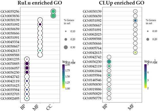 This plot shows the enriched ontologies resulting from the ORA for the RuLu and CLUp DEGs, respectively. The size of the bubble represents the ratio of DEGs divided by the total number of genes composing each ontology term (in %). The hue represents the significance scores (−log10 FDR). The x-axis indicates the ontologies used: biological processes (BPs), cellular components (CCs), and molecular functions (MFs).