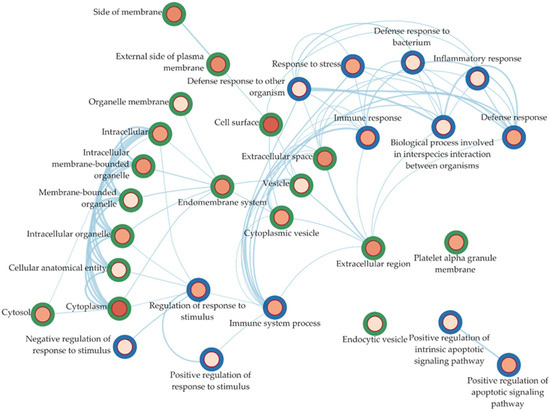 This figure highlights the interactions between the enriched ontologies for the DEGs belonging to the RuLu group. The BP ontologies are outlined in blue, while the CC ontologies are outlined in green. The hue represents the significance of the nodes, with red being more significant. Ontologies with a high number of shared genes were automatically fused together.