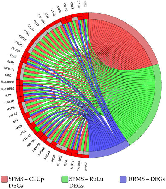 In this chord plot, we report the CLUp DEGs (left-hand side) and the phenotypic groups in which they were differentially expressed (right-hand side). On the left, the outer ring reports the expression status in SPMS patients, while the inner one reports the expression status in RRMS patients. Red genes are up-regulated and green are down-regulated, while gray represents no differential expression. DEGs belonging to the CLUp group are linked to the red sector on the right-hand side; DEGs belonging to the RuLu group are linked to the green sector; and genes found to also be differentially expressed in RRMS patients are linked to the blue sector. The 21 selected genes were up-regulated in SPMS (outer ring in red) and down-regulated or not DEGs in RRMS (inner ring in gray or green).