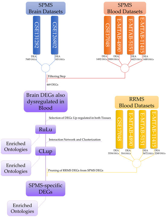The flowchart of our analysis. The filtering step was performed by applying the cut-off described in Section 2.3. A similar cut-off was also applied for the RRMS DEGs before the pruning step. Details of the DEGs obtained in the DEA are reported in the Supplementary Materials.