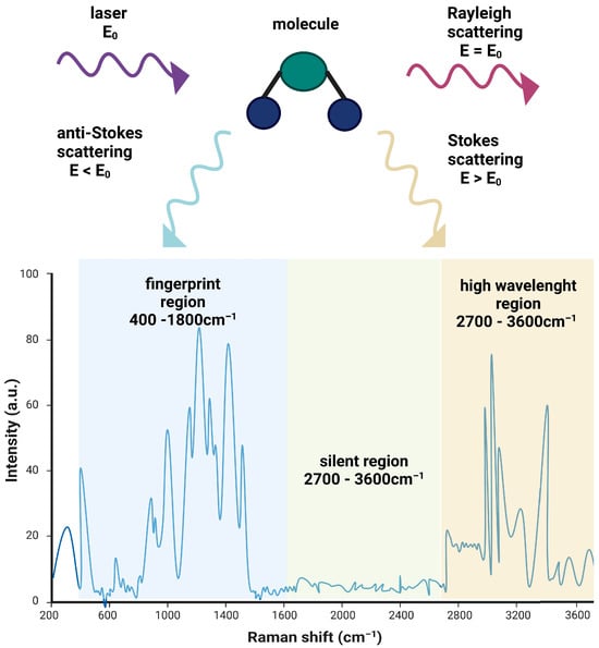 Raman spectroscopy (RS) stands out among molecular spectroscopy techniques as it enables label-free and non-destructive detection and identification of molecules. This is achieved through the analysis of characteristic spectra unique to each molecular system []. RS operates on the principle of inelastic light scattering by matter, which was discovered by Chandrasekhara Venkata Raman in 1928 and named after him as the “Raman effect” []. When monochromatic light interacts with a molecule, most photons undergo elastic scattering, maintaining their energy and retaining the same frequency as the incident light (known as Rayleigh scattering). In contrast, a small fraction of the light experiences inelastic interactions with molecular vibrations []. This results in scattering at distinct optical frequencies determined by the energy gain (Stokes shift) or loss (anti-Stokes shift) (Figure 1). This subtle change in energy corresponds to the molecular vibrations associated with the chemical bonds within the sample, providing an insight into its molecular structure and composition. Analyzing how the distribution of inelastic scattering light intensity correlates with frequency allows for the differentiation of unique spectral patterns associated with various samples. The spectra produced by nucleic acids, proteins, lipids, and carbohydrates containing Raman-active functional groups can be employed to assess the metabolic state of different cells and tissue types, each characterized by its unique composition [].
