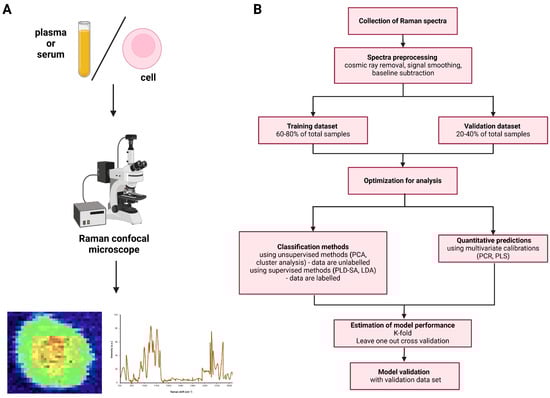 Translation of Raman data into biologically and/or medically useful information requires utilization of complex statistical analysis and machine learning, of which a simplified scheme has been presented in Figure 2B. Most commonly used tools include principal component analysis (PCA), linear discriminant analysis (LDA) or supervised partial least-squares discriminant Analysis (PLSDA) [].