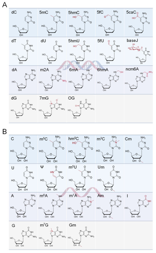 Nucleic acid modifications play important roles in regulating gene expression, cell differentiation, and individual development [1,2]. These modifications do not change the gene sequence, but can expand genetic information [3]. Unlike gene sequences, these modifications dynamically change throughout an individual’s lifecycle thanks to various environmental factors. With the advance of research, more and more diseases have been proven to be related to changes caused by nucleic acid modification, and have been considered as potential targets for precise diagnosis and personalized treatment [4].