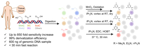 | i-Pr2N | ![]() | 5hmC | 5 mg of MnO2 in 20 μL reaction volume, 50 °C, 1 h; 5 μL of oxidation product, 1 μL of HAc, 14 μL of 50 mM i-Pr2N solution, vortex and dry | 14 amol | 178 folds | 0.6–2.4 ng of cell-free DNA | [91] |