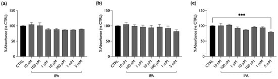 IPA does not significantly affect cellular viability. BAE-1 cells were treated with different concentrations of IPA for 4 h (a), 24 h (b), or 48 h (c), and then an MTS assay was performed. Data, expressed as a percentage referring to the control condition (untreated cells), are represented as mean ± SEM, *** p < 0.001. Values of the n = 3 independent experiments were as follows: (a) CTRL: 100.00 ± 1.98; IPA 10 nM: 104.40 ± 6.32; IPA 100 nM: 100.98 ± 8.95; IPA 1 μM: 88.20 ± 3.80; IPA 10 μM: 88.60 ± 2.83; IPA 100 μM: 86.80 ± 2.15; IPA 1 mM: 86.86 ± 1.11; IPA 5 mM: 89.00 ± 1.03; (b) CTRL: 100.00 ± 0.78; IPA 10 nM: 104.79 ± 5.79; IPA 100 nM: 99.44 ± 4.06; IPA 1 μM: 96.44 ± 5.87; IPA 10 μM: 94.24 ± 6.97; IPA 100 μM: 96.55 ± 7.99; IPA 1 mM: 92.10 ± 7.21; IPA 5 mM: 82.12 ± 5.02; (c) CTRL: 100.00 ± 1.54; IPA: 10 nM 100.69 ± 7.70; IPA 100 nM: 102.88 ± 2.47; IPA 1 μM: 92.37 ± 3.66; IPA 10 μM: 86.40 ± 1.63; IPA 100 μM: 96.03 ± 2.50; IPA 1 mM: 94.06 ± 2.62; IPA 5 mM: 79.40 ± 1.78. IPA = indole-3-propionic acid.