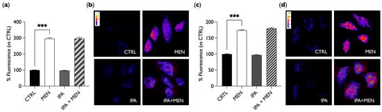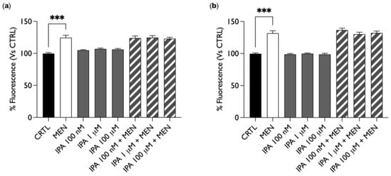 As shown in Figure 2, IPA did not increase the production of ROS, unlike MEN, which, as expected, induced a fluorescence increase. Moreover, in cells treated simultaneously with MEN and IPA, there was no reduction in fluorescence intensity as compared to MEN treatment only. This result indicates that IPA does not induce by itself the production of ROS but, at the same time, it does not show any antioxidant activity either since it does not counteract the effect of the oxidative stressor. Similar results were obtained with both acute (30 min, Figure 2a) and chronic (24 h, Figure 2b) IPA stimulation.