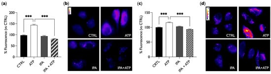 IPA reduces ATP-induced NO release. (a,c) Bar graphs summarize the effect on NO release after the stimulation with 100 µM of ATP and 1 µM of IPA, alone or together, compared to the control after 30 min (a) or 24 h (c) of IPA treatment. Data in percentages referring to the control condition are represented as mean ± SEM, *** p < 0.001. Values of the n = 3 independent experiments were as follows: (a) CTRL: 97.99 ± 1.81, n cells = 156; ATP: 143.80 ± 3.24, n cells = 158; IPA: 93.96 ± 2.75, n cells = 143; IPA + ATP: 81.00 ± 2.30, n cells = 160; (c) CTRL: 100.00 ± 1.09, n cells = 150; ATP: 116.33 ± 1.85, n cells = 150; IPA: 102.76 ± 1.48, n cells = 135; IPA + ATP: 93.22 ± 1.54, n cells = 137. (b,d) Representative fluorescent images (50×) of DAR4M-AM probe-labeled cells treated for 30 min (b) or 24 h (d). Images are presented in pseudocolor (LUT = fire) to better show the fluorescence intensity variations (range 11–120 (b), 11–89 (d)). IPA = indole-3-propionic acid, ATP = adenosine triphosphate.