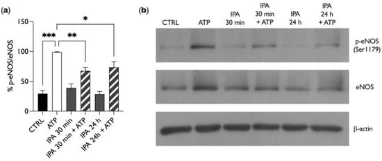 To elucidate the mechanism involved in the IPA-dependent inhibition of NO release in BAE-1 cells stimulated by ATP, we performed a Western blot analysis of the Ser1179-phosphorylation level of endothelial nitric oxide synthase. It is indeed established that extracellular ATP binds to endothelial P2Y2 receptors, starting an intracellular cascade leading to Ser1179 eNOS phosphorylation (and consequent activation) []. For these experiments, the experimental conditions were the same as those described for Figure 4. As represented in Figure 5, ATP enhanced nitric oxide synthase phosphorylation, as expected. Interestingly, IPA treatment for both times did not affect eNOS phosphorylation, for which the levels remained the same as in the control (untreated cells). However, in the presence of IPA, ATP failed to increase the eNOS phosphorylation level, thus confirming the previous result on NO release. These data suggest that IPA reduces the purinergic-dependent NO release by lowering the Ser1179 phosphorylation level of eNOS.
