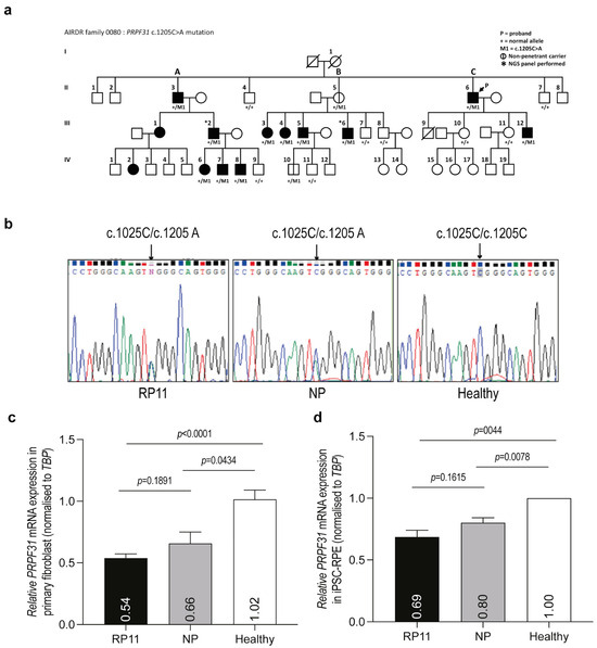 Characterization of PRPF31 mutation and expression in RP11 patients and a non-penetrant family member within a large RP11 pedigree that shows incomplete penetrance. (a) RP11 pedigree with sample code used in this study (generations I–IV, families A, B, C). Black fill: affected RP11 patients with a confirmed diagnosis (PRPF31 c.1205 C>A). Vertical line: non-penetrant subject. Arrow: proband. (b) Sanger sequencing chromatograms showing PRPF31 sequence amplified from genomic DNA indicating the position of c.1205 (arrow) in an RP11 and a non-penetrant individual, compared to a healthy control. (c) RT-qPCR analysis of total PRPF31 expression in fibroblasts from RP11 patients (n = 5 patients, c.1205 C>A), a non-penetrant family member (II5, c.1205 C>A), and an unaffected control. The expression of PRPF31 was normalized to that of TATA-binding protein (TBP). PRPF31 expression in the healthy control was set to 1. n = 3 independent experiments in triplicates were performed. Student’s t-test. (d) RT-qPCR analysis of total PRPF31 expression in iPSC-derived RPE from an RP11 patient (III6, c.1205 C>A), a non-penetrant family member (II5, c.1205 C>A), and an unaffected, healthy subject. The expression of PRPF31 was normalized to that of TBP. The PRPF31 expression in the healthy subject (control) was set to 1. n = 3 independent experiments in triplicate were performed. Student’s t-test.