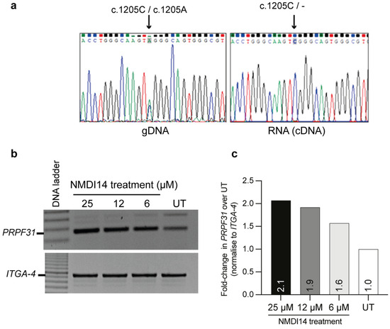 The PRPF31 c.1205 C>A mutation is annotated to create a PTC in exon 12. This PTC is 71 bases upstream of the EJC and should render the affected transcript susceptible to degradation through NMD. No transcript carrying the PRPF31 c.1205 C>A variant was amplified from the RP11 patient-derived RNA. We further assessed the expression and the susceptibility of this transcript to nonsense-mediated mRNA decay using an NMD inhibitor (NMDI14). After patient fibroblasts were treated with the NMD inhibitor, the PRPF31 transcripts increased in a dose-dependent manner, as determined using semi-quantitative RT-PCR (Figure 2a,b), suggesting substantial degradation of the transcripts encoded by the disease-associated allele in patient fibroblasts, due to NMD. Sanger sequencing of the amplicons confirmed the presence of the PRPF31 c.1205 C>A transcript in the absence of NMD.