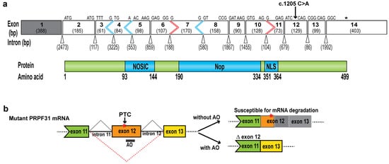 The PRPF31 gene includes 14 exons that encode a protein of 499 amino acids that function in pre-mRNA splicing in all cell types. The functional domains of PRPF31 include the Nop domain and nuclear localization sequence that are encoded by exons 7–10 and exons 10–11, respectively. To the best of our knowledge, no pathogenic deletions of, or mutations causing, PRPF31 exon 12 skipping have been reported to date.