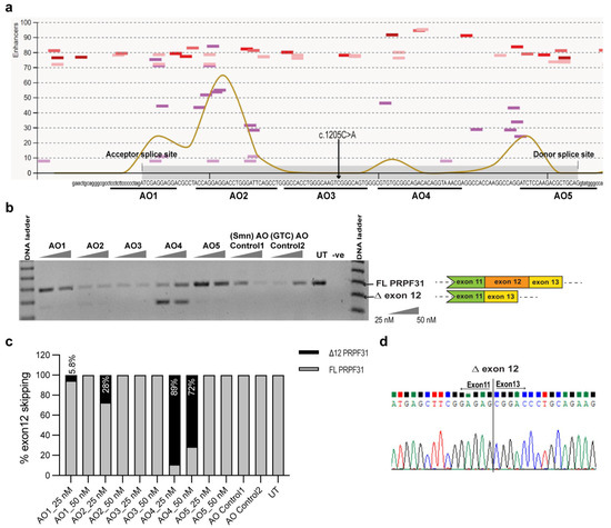 Five splice-switching AOs were designed as 25-mers to target exonic splice enhancer (ESE) motifs in PRPF31 exon 12 or donor/acceptor splice sites to inhibit exon recognition during pre-mRNA splicing (sequences listed in Table 1). The ESE motifs were predicted using the following online tools: Human Splice Finder version 3.1: http://www.umd.be/HSF/ (accessed on 20 June 2019) and SpliceAid: http://www.introni.it/splicing.html (accessed on 20 June 2019). Predicted ESE motifs and target regions of each AO along the exon are presented in Figure 4a. The splice-switching AOs were synthesized as chemically modified 2′O-methyl bases on a phosphorothioate backbone.