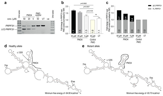 To explore why PMO4 exhibited a stronger tendency to skip exon 12 in the mutant transcript compared to the healthy allele, an analysis was conducted on alterations in splicing motifs and the secondary structure of PRPF31 mRNA. The prediction of splicing motifs within PRPF31 exon 12 indicated that the mutation at c.1205 did not affect splicing strength (refer to Figure 4a). Using an online tool (RNAfold), predictions were generated for the secondary structure of exon 12 and its flanking intron regions (50 nucleotides on each end). As demonstrated in Figure 5d,e, a slight elevation in the minimum free energy was determined in the mutant allele compared to the healthy allele, with a lower minimum free energy state suggesting greater stability of the latter structure.