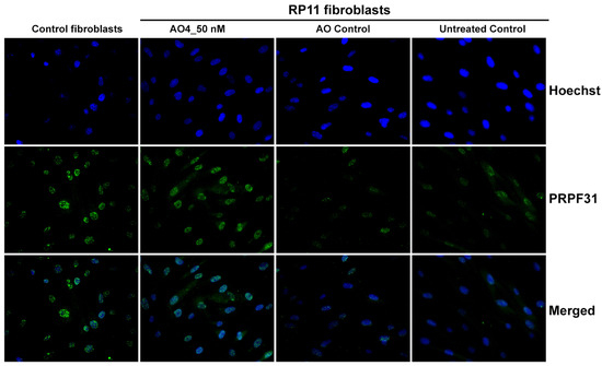 The expression and localization of PRPF31 in healthy fibroblasts and patient fibroblasts harboring the nonsense mutation were assessed by immunofluorescent staining. The PRPF31 protein was localized in the nucleus of the RP11 patient fibroblasts, while the protein expression level was reduced relative to the healthy control, as shown in Figure 6. When the RP11 cells were treated with PMO4, the truncated protein remained localized in the nucleus of RP11 cells, with a moderate enhancement of PRPF31 expression. Importantly, aberrant PRPF31 protein accumulation or cytoplasmic localization due to the production of the alternative PRPF31 isoform was not observed in this study. The results suggest that the domain encoded by PRPF31 exon 12 may be partially dispensable and that the exon could be removed from the transcript while allowing the induced PRPF31 isoform to retain some function.