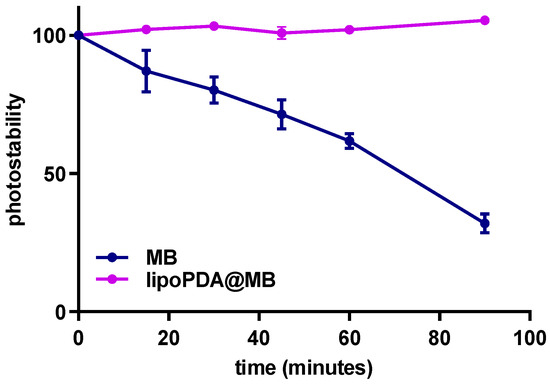 As shown in Figure 3, photobleaching of free MB was much faster than that of lipoPDA@MB, indicating that the process of photodegradation was less effective in the latter than in the solution of MB.