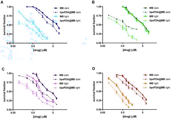Dose-response curves obtained following 24 h treatment of HCT116 (A), HT29 (B), MCF7 (C), and MDA-MB231 (D) cells with MB and lipoPDA@MB, 1 h irradiation, 24 h incubation in drug-free medium, and MTT assay (mean ± S.D. of 3–4 independent experiments).