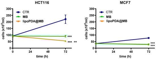 The effects of free and lipoPDA-loaded MB were also evaluated in spheroids obtained from HCT116 and MCF7 cells. Specifically, spheroid growth and cell viability were evaluated following 24 h of treatment with MB and lipoPDA@MB at concentrations corresponding to IC50 values obtained in monolayer-cultured cells, 1 h irradiation, and incubation in a drug-free medium in the dark. The results are reported in Figure S3 and Figure 5. Pictures of the spheroids were taken through a camera connected to an Olympus IX8I microscope following irradiation (0), and 72 h later. At the same time, 3/5 spheroids were collected, disaggregated, and live cells were counted based on a dye exclusion assay. The growth curves were drawn (Figure 5).
