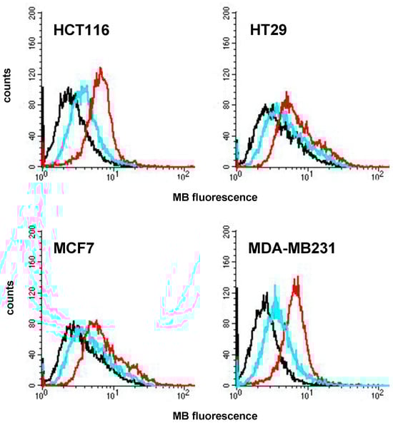 MB and lipoPDA@MB cellular uptake was then assessed through flow cytometry by exploiting MB fluorescence. Similar results to those shown in Figure S4 were obtained and reported in Figure 6. Interestingly, the same trend was evidenced in all cell lines, as higher MB fluorescence levels were observed in lipoPDA@MB-treated cells than in MB-treated ones, indicating that lipoPDA@MB vesicles entered all the cell lines better than free MB. However, as evidenced in the preliminary accumulation experiments, HCT116 and MDA-MB231 cells accumulate lipoPDA nanoparticles at a higher extent than HT29 and MCF7 cells.