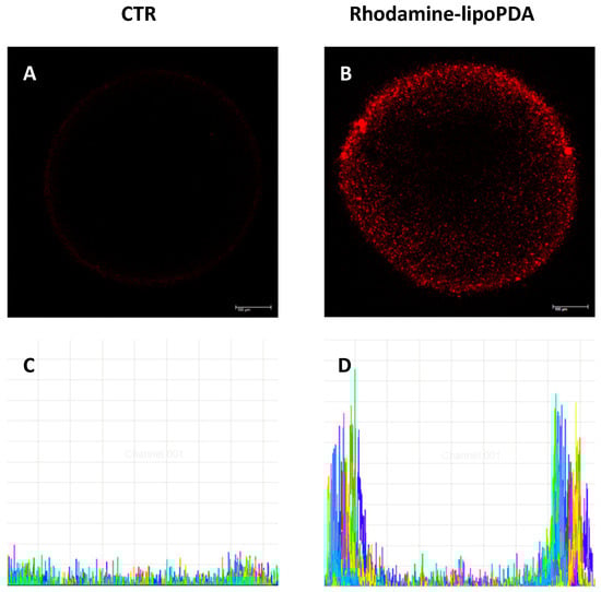 Confocal microscopy images obtained on HCT116 spheroids (Figure 7A,B) and the analysis of the distribution and intensity of PS fluorescence in the images of the equatorial planes (Figure 7C,D) indicate that lipoPDA vesicles also enter 3D-cultured cells. Furthermore, penetration of Rhodamine-lipoPDA vesicles was limited to the external cell rim of the spheroids, while in their inner core, only low fluorescence was detected, meaning lower penetration of the vesicles in that part of spheroids.