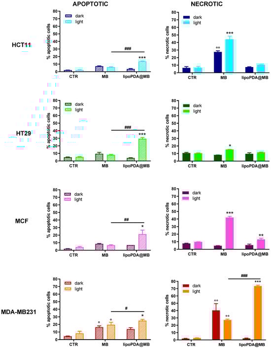 Percentages of apoptotic and necrotic HCT116, HT29, MCF7, and MDA-MB231 cells, following 24 h treatment with MB and lipoPDA@MB at equitoxic concentrations corresponding to the respective IC50 values, 1 h irradiation (500 W, irradiance 22 mW/cm2; fluence of 100 J/cm2), 24 h incubation in drug-free medium. Propidium iodide was used as a DNA probe (mean ± SE of 3 independent experiments; ° p < 0.05 and °° p < 0.01 vs. CTR; * p < 0.05, ** p < 0.01 and *** p < 0.001 vs. CTR and dark; # p < 0.05, ## p < 0.01, ### p < 0.001).