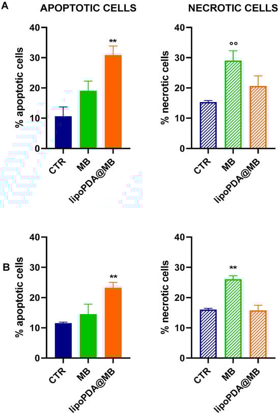 Percentages of apoptotic and necrotic cells obtained from HCT116 (A) and MCF7 (B) spheroids following 24 h incubation with MB and lipoPDA@MB at concentrations corresponding to the IC50 values obtained in monolayer-cultured cells, 1 h irradiation (500 W, irradiance 22 mW/cm2; fluence of 100 J/cm2), and 72 h incubation in a drug-free medium. Propidium iodide was used as a DNA probe (mean ± S.D. of 3 independent experiments in which 3/5 spheroids/treatment were used; °° p < 0.01 vs. CTR; ** p < 0.01 vs. CTR and MB).